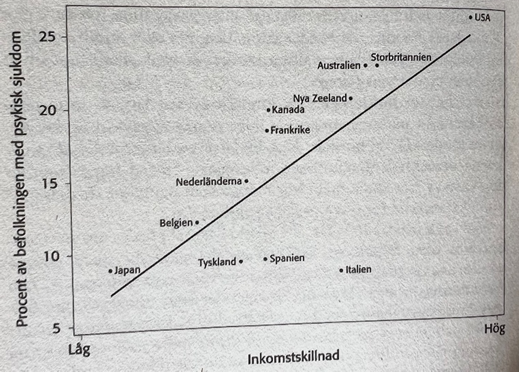 I diagrammet nedan kan man utläsa ett tydligt samband mellan inkomstskillnader (ojämlikhet) och omfattningen av psykisk ohälsa. Dessa data är från de länder där WHOs Och World Health Survey Consortiums mall tillämpats så likartat som möjligt för att mäta graden av psykisk ohälsa i respektive land och då även indelat på olika kategorier. Sverige är dessvärre inte med i just denna undersökning men finns mestadels med i övriga undersökningar i materialet.