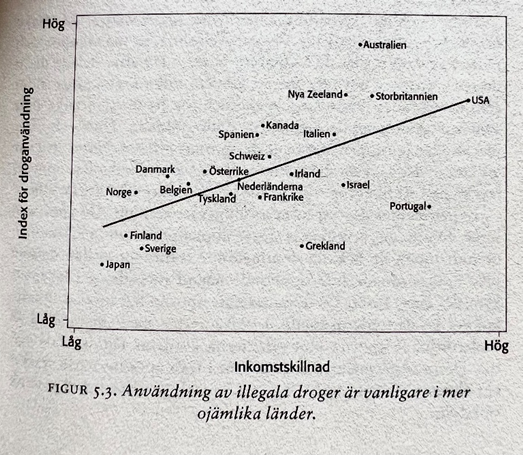 Det ser ju rätt bra ut för oss, men då skall vi minnas att boken gavs ut 2009 då den senaste utvecklingen mot större ojämlikhet, ökad psykisk ohälsa och ökat drogmissbruk ännu bara börjat från ett jämförelsevis acceptabelt utgångsläge. Vi vet ju att dessa problem båda har accelererat och faktiskt i takt med att ojämlikheten ökat till följd av den politik som drivits i landet.
